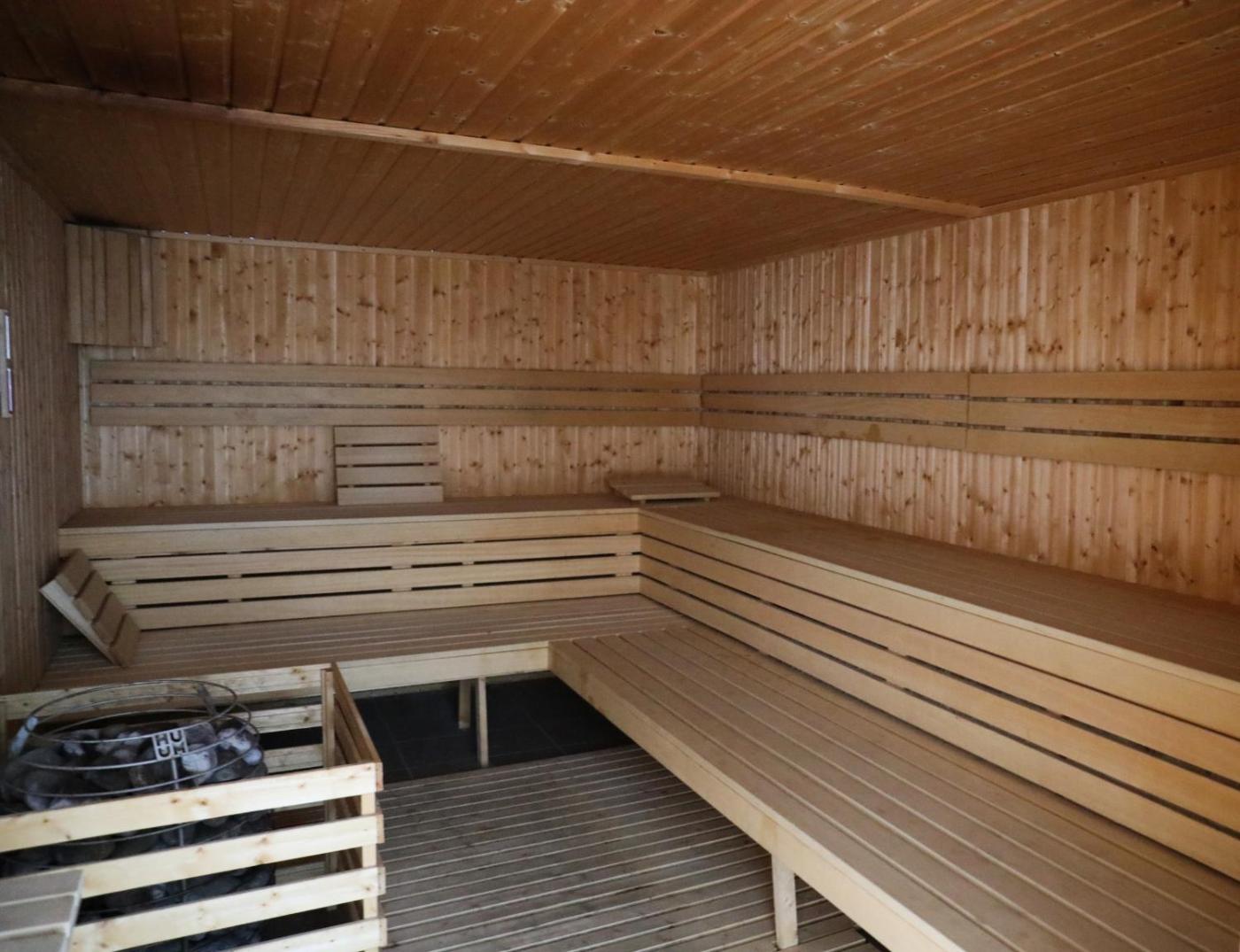 Zaplecze odnowy biologicznej obiektu Jantar Porta Mare apartament obejmuje kryty basen, saunę i wannę z hydromasażem.