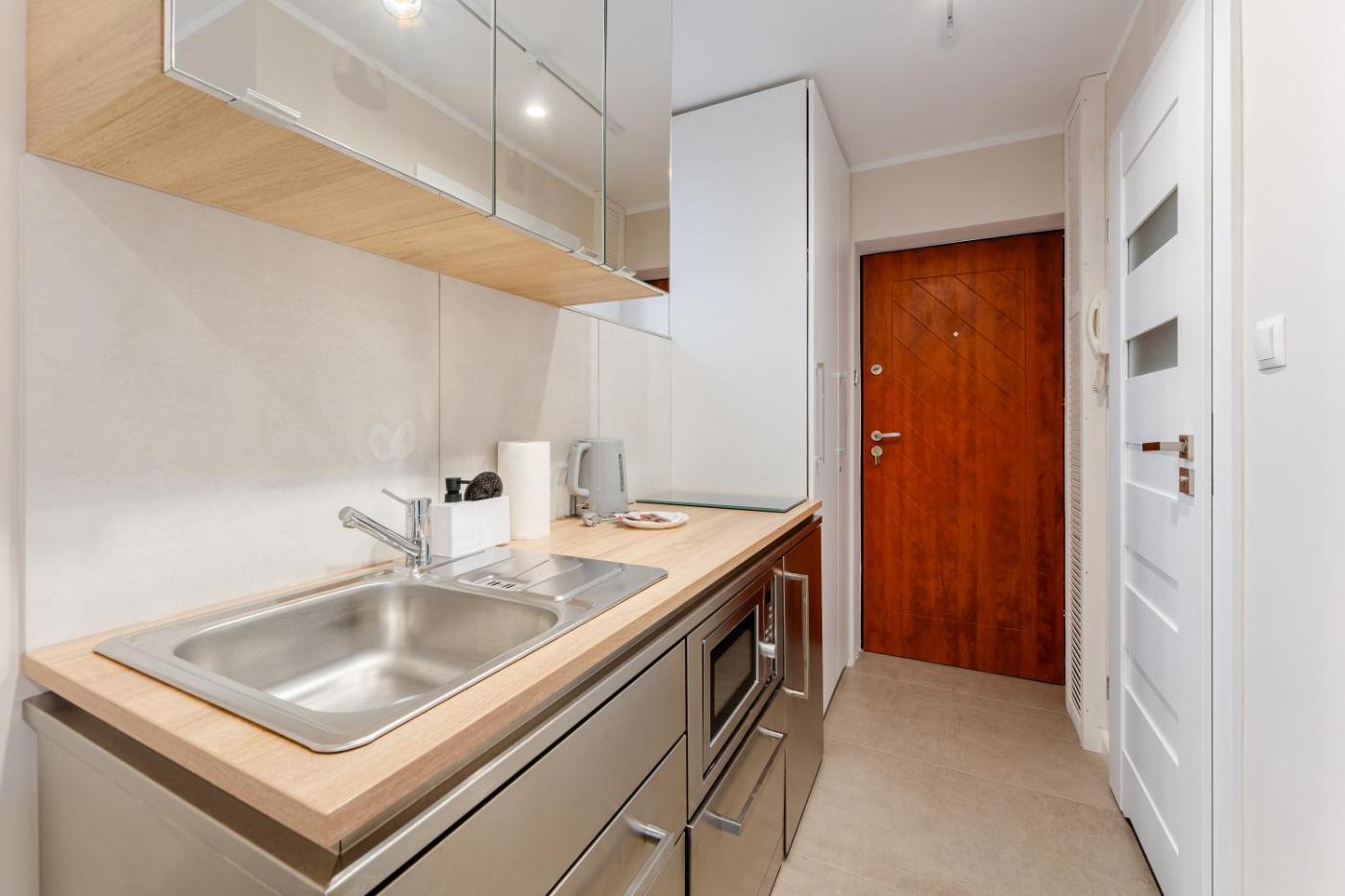 Studio z balkonem. Offering free toiletries, this studio includes a private bathroom with a shower and a hairdryer. Guests can make meals in the kitchenette that is fitted with a stovetop, a refrigerator, a dishwasher and kitchenware. Featuring a balcony, this studio also offers a washing machine, a private entrance and a flat-screen TV with satellite channels. The unit offers 1 bed. Studio - 2 osobowy. Powierzchnia pokoju ok.: 17 mkw.