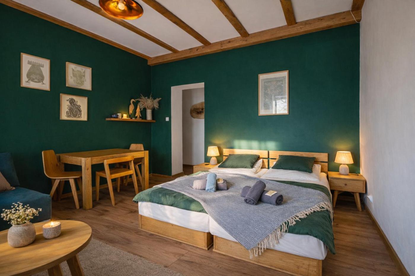 Pokój rodzinny. This family rooms standout feature is the sauna. The family room offers a tea and coffee maker and a wardrobe, as well as a private bathroom featuring a walk-in shower. The family rooms kitchenette, which features a refrigerator and kitchenware, is available for cooking and storing food. A sofa, a flat-screen TV, a barbecue and an outdoor dining area are featured in this family room. The unit offers 3 beds. Rodzinny - 4 osobowy. Powierzchnia pokoju ok.: 16 mkw. ;